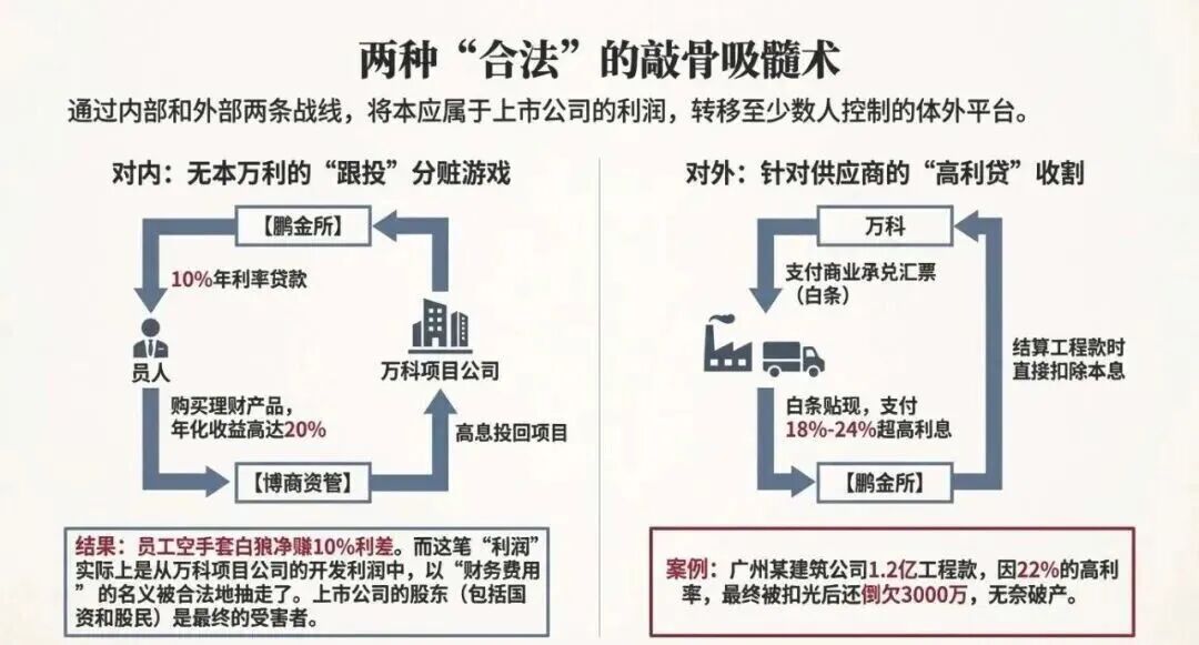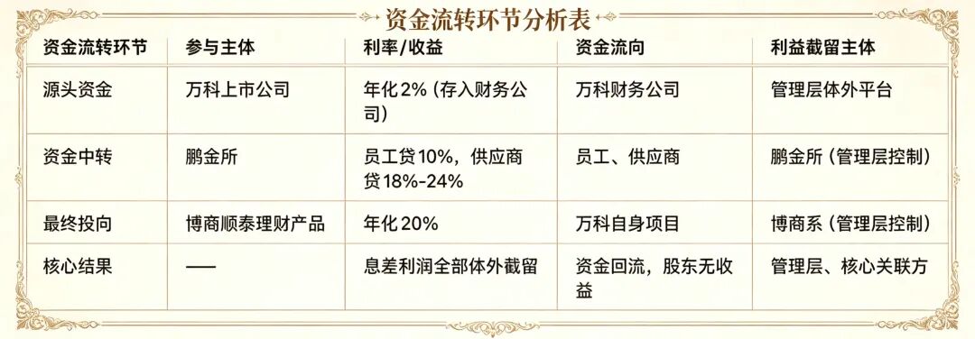 影子万科的终极杀招,是构建了一套“万科财务公司—鹏金所—博商顺泰”的闭环资金流转体系,通过人为操纵利率差,层层截留上市公司的资金利润,形成一套高效且隐蔽的“资金抽水系统”,让同一笔资金在体外循环一圈,产生的巨额息差利润全部落入管理层口袋,上市公司则分文未得。