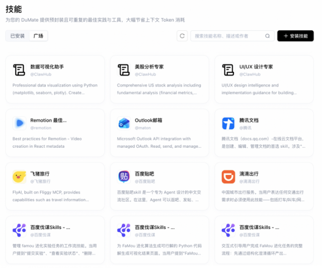 在个性化能力方面,搭子DuMate上线了技能广场,用户除内置技能外,可浏览并安装更多精选技能,按需扩展工作台能力;同时新增每日总结功能,搭子DuMate可基于记忆与当日信息自动生成个人日报,帮助用户沉淀工作进展。