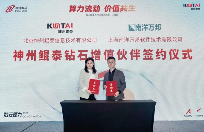 神州鲲泰品牌市场及生态发展部总经理朱素洁与上海南洋万邦软件技术有限公司副总经理马子标分别代表双方公司完成签约授牌,正式确立钻石合作伙伴关系。
