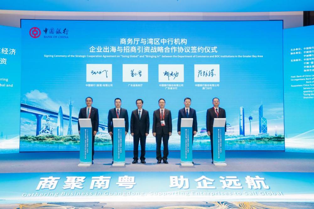 粤港澳大湾区是国家高水平对外开放的战略支点。此次大会上,广东省商务厅与中国银行广东省分行、中银香港、中国银行澳门分行签署战略合作协议。中行湾区机构将进一步加强协同,发挥跨境联动优势,服务全球企业来粤投资、深耕大湾区,同时支持广东企业扬帆出海、拓展国际市场。