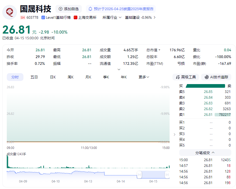 4月13日晚,国晟科技公告:公司筹划近5个月、总价2.41亿元的孚悦科技收购案,因贷款未能获批,正式宣告终止。次日开盘,市场给出了最直接的回应——一字跌停,封单超21亿元,4月15日,国晟科技开盘再跌停,4万追高股民,直接被闷杀在山顶。