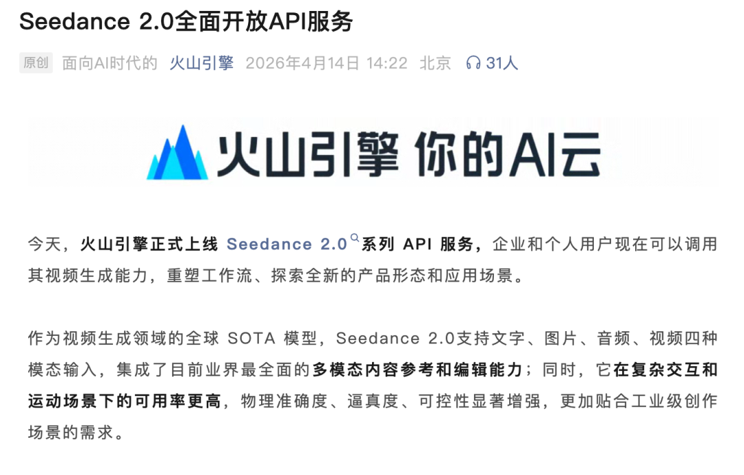 4月14日,火山引擎宣布Seedance 2.0全面开放API服务,对阿里展开反击。
