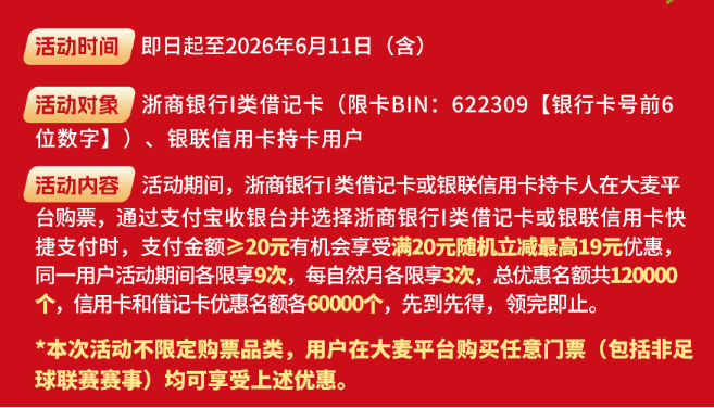 其中显示,即日起至2026年6月11日(含),浙商银行I类借记卡或银联信用卡持卡人在大麦平台购票,通过支付宝收银台并选择浙商银行I类借记卡或银联信用卡快捷支付时,支付金额≥20元有机会享受满20元随机立减最高19元优惠,同一用户活动期间各限享9次,每自然月各限享3次。