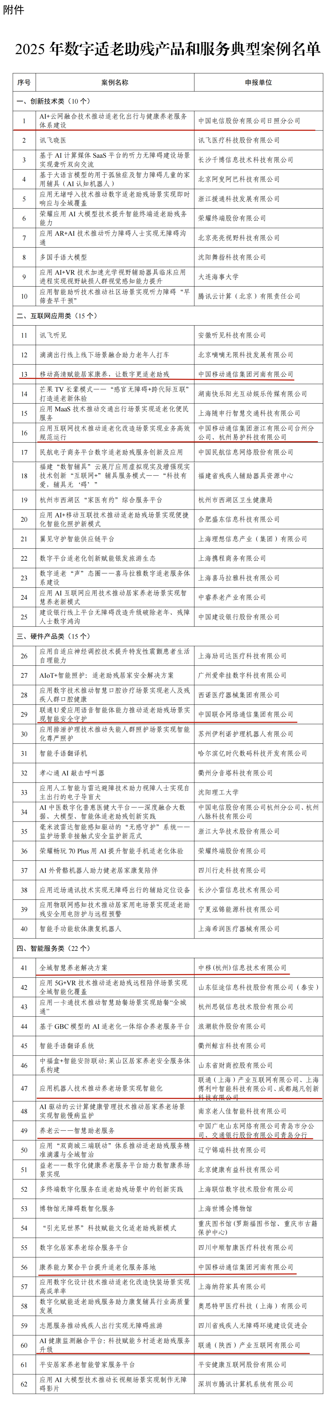 近日,工信部公布了《2025年数字适老助残产品和服务典型案例》,确定62个2025年数字适老助残产品和服务典型案例。公布的典型案例分为创新技术(10个)、互联网应用(15个)、硬件产品(15个)、智能服务(22个)四大类。