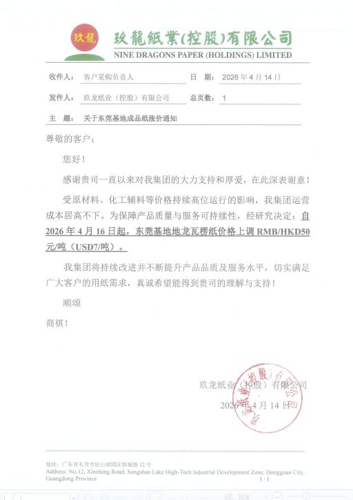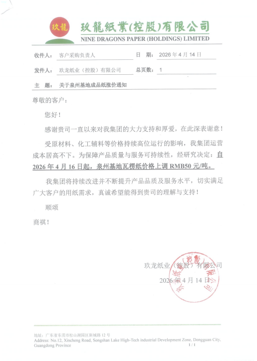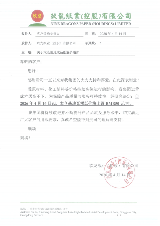 4月14日,受原材料、化工辅料等价格持续高位运行的影响,泉州、东莞和太仓基地宣布4月16日起,瓦楞纸价格上调50元/吨。