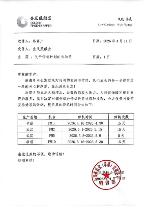 金凤凰纸业表示,此轮停机是由于近期各项成本大幅增加,经营面临较大压力。