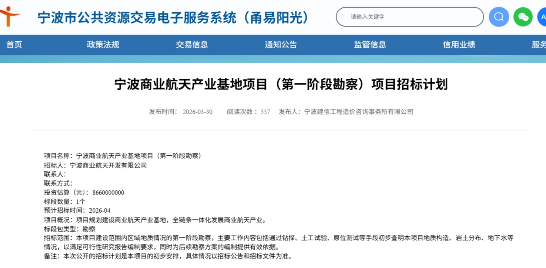 日前,宁波市政务服务中心官网显示,宁波商业航天产业基地项目(第一阶段勘察)将于4月开启招标。