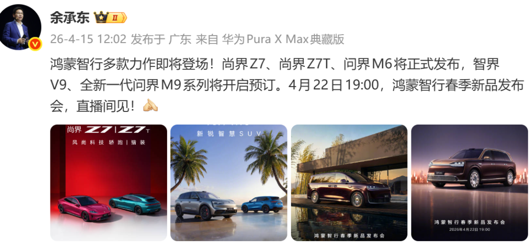 电动知家消息,今天中午,华为常务董事、产品投资评审委员会主任、终端BG董事长余承东发布消息,在4月22日举行的鸿蒙智行春季新品发布会上,鸿蒙智行将发布五款新车,尚界Z7、尚界Z7T、问界M6、智界V9以及全新一代问界M9系列。其中尚界Z7、尚界Z7T、问界M6是正式发布,智界V9、全新一代问界M9系列将开启预订。