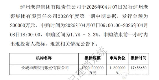 泸州老窖发行20亿元票据 长城华西银行却在申购截止前4分钟不买了?