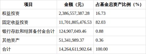 报告期末基金总资产142.65亿元,其中固定收益投资占比82.03%,金额117.02亿元;权益投资(全部为股票)占比16.73%,金额23.87亿元;银行存款和结算备付金占0.88%,其他资产占0.36%。资产配置符合债券型基金定位,固定收益为核心,权益资产作为增强收益工具。