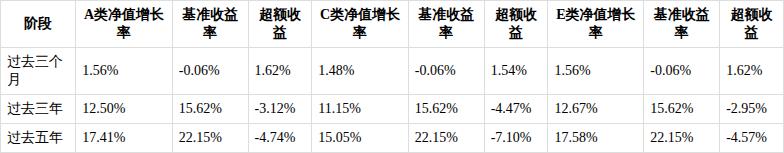 长期业绩方面,三类份额均落后基准。过去三年,A类净值增长12.50%(基准15.62%),落后3.12%;C类增长11.15%(基准15.62%),落后4.47%;E类增长12.67%(基准15.62%),落后2.95%。过去五年,A类、C类、E类分别跑输基准4.74%、7.10%、4.57%。