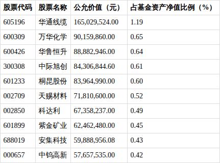 前十大重仓股:华通线缆占比1.19%制造业个股占九成