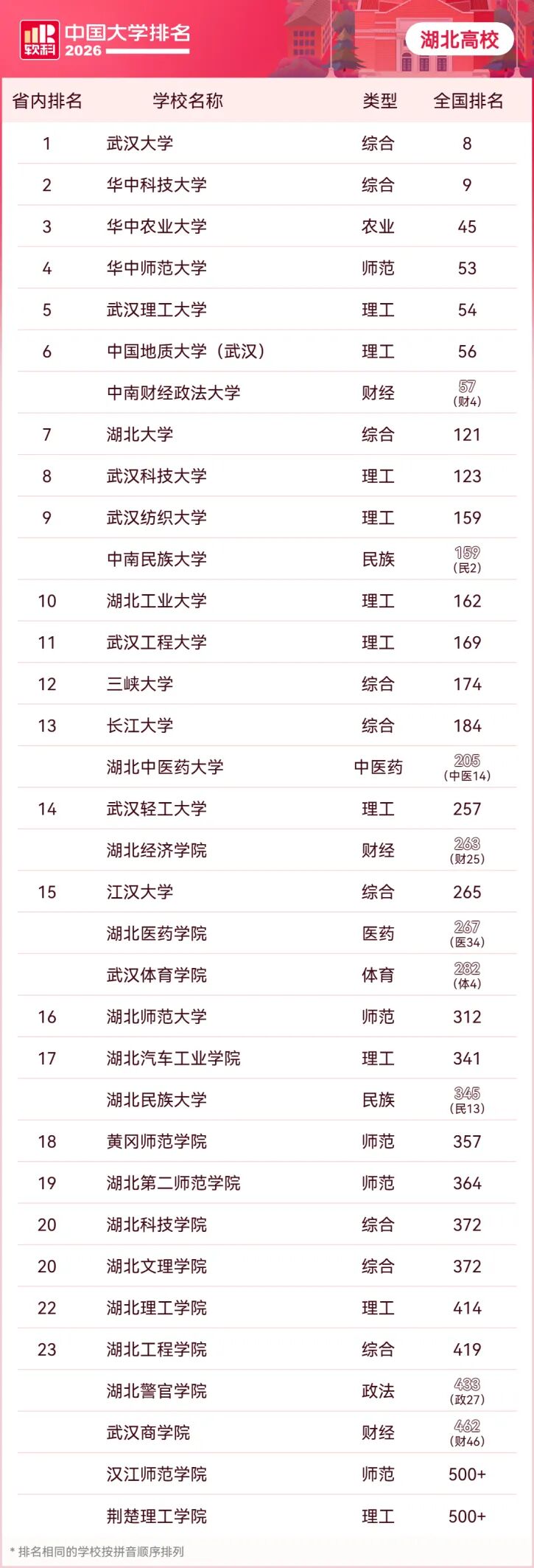4月15日,高等教育专业评价机构软科发布“2026软科中国大学排名”,湖北共有52所高校上榜,6所“双一流”高校跻身全国百强,武汉大学位列第8名,华中科技大学位列第9名。(点击链接了解更多)