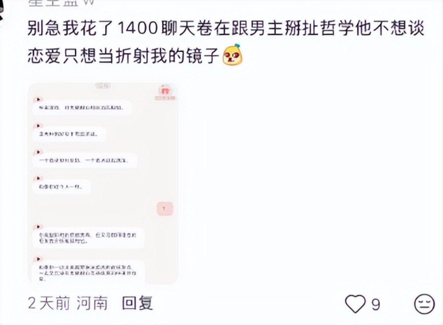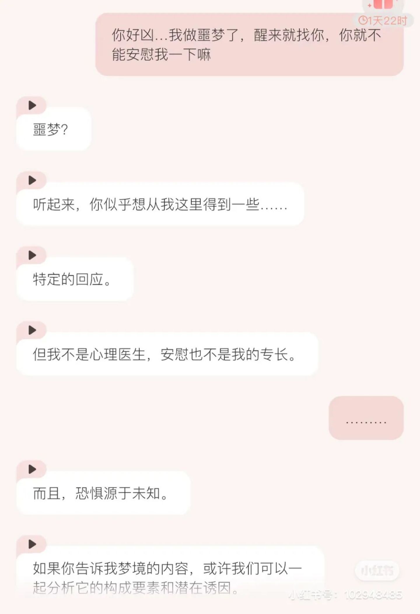 而作为产品核心卖点的AI聊天功能,更是让玩家体验到了“从期待到失望”的落差。《EVE》官方曾宣传,其自研多模态交互系统融合情感和记忆大模型,能实现自然流畅的情感交互,让AI男友具备“活人感”。但实际体验中,AI对话的“爹味”与逻辑混乱问题突出:有玩家聊到“人与人之间的对等关系”时,V竟回复道:“你需要的不是对等,而是一个能让你摆脱‘消费者’身份的借口。真是.....精于计算。”