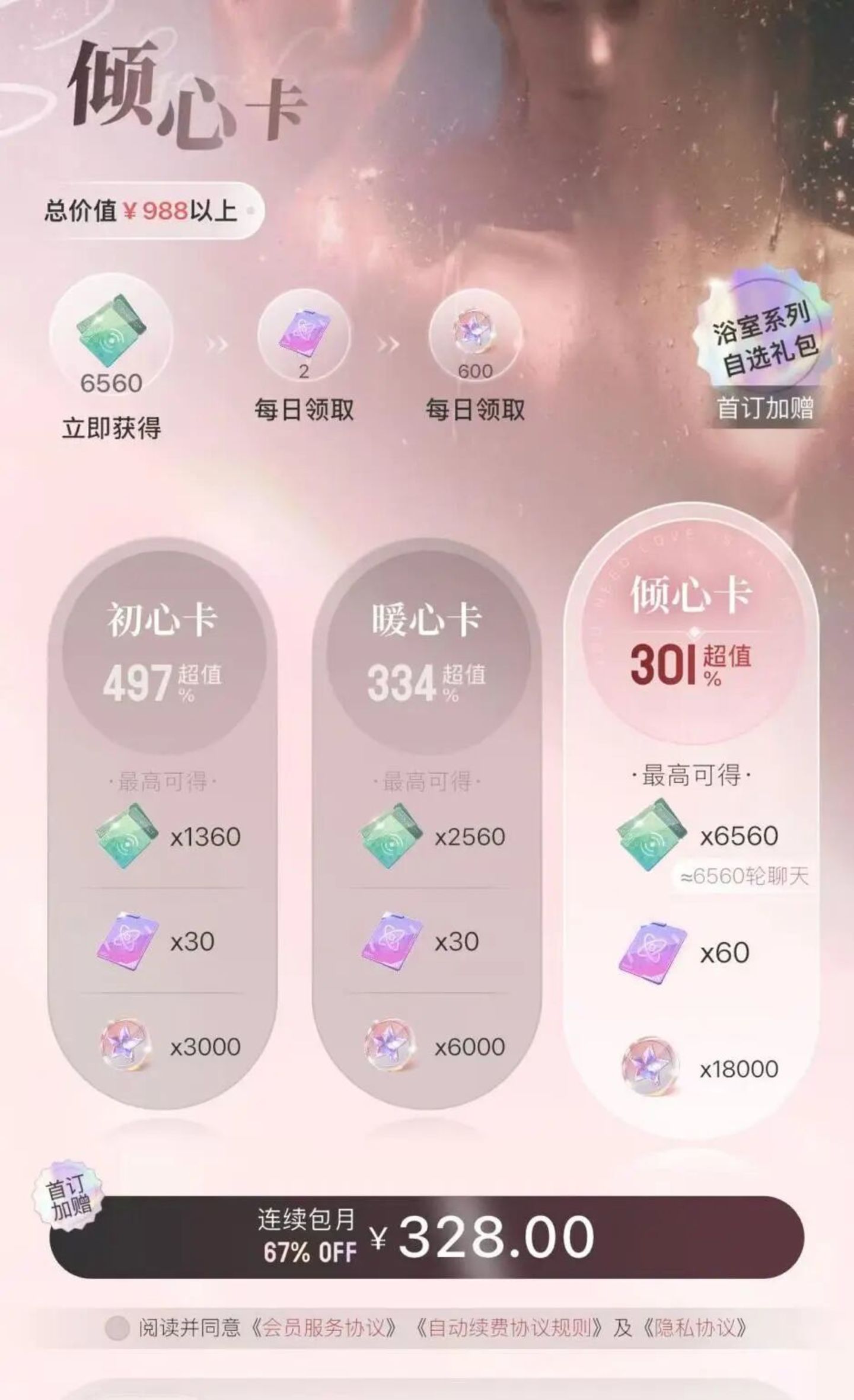 《EVE》的定价也比较高,传统乙女游戏的月卡定价普遍在30元左右,而《EVE》却推出了分层付费模式:基础聊天功能定价68元,语音陪伴功能128元,全功能月卡更是高达328元。有玩家算了一笔账,若想与AI男友进行高频聊天,每月的消费甚至超过500元,据业内人士透露,AI情感陪伴产品的算力成本约占运营成本的40%。