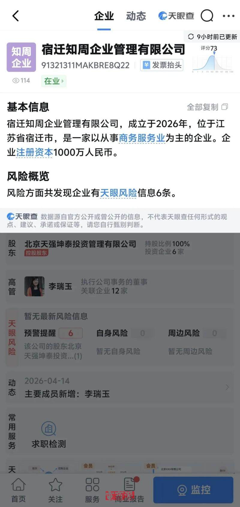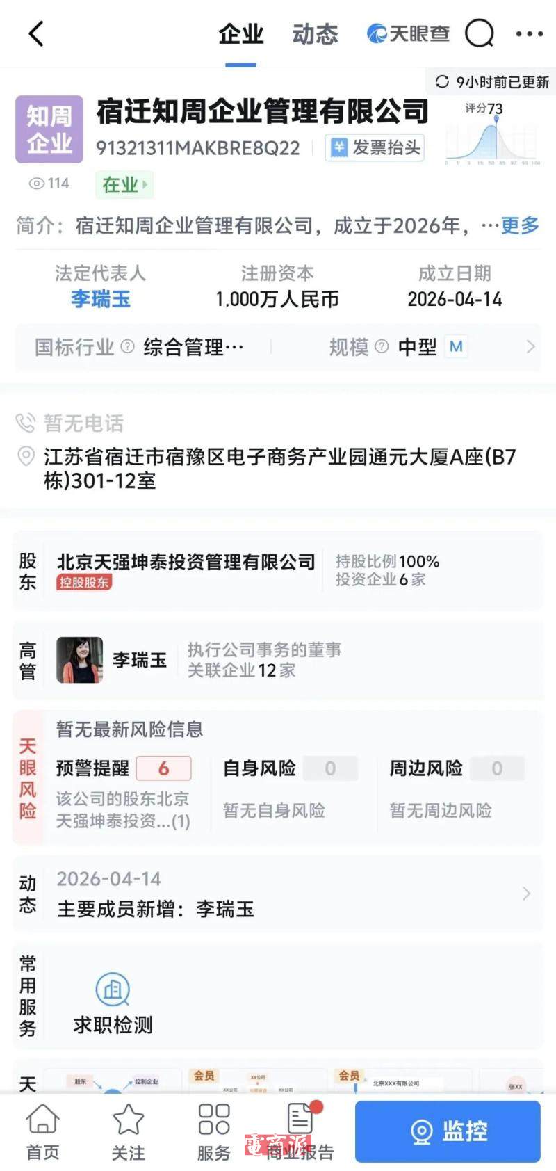 4月9日,宿迁天强企业管理有限公司、宿迁天智时代企业管理有限公司在同一天注册成立,注册资本均为1000万,法定代表人同样是李瑞玉。