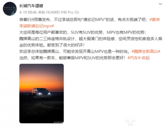 据了解,最近几年,长城汽车在MPV市场逐渐形成了一定的影响力,特别是以魏牌高山为代表的高端新能源MPV系列,市场反响不错,就在4月9日,魏牌才刚宣布,魏牌高山10万台正式下线,所以,李斌的“请忘记MPV”肯定使长城不爽。