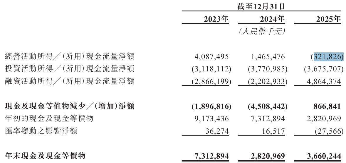 赴港“补血”的急迫性,在现金流数据中体现得最为直接。2025年,天华新能经营活动现金流净流出3.22亿元,由正转负。