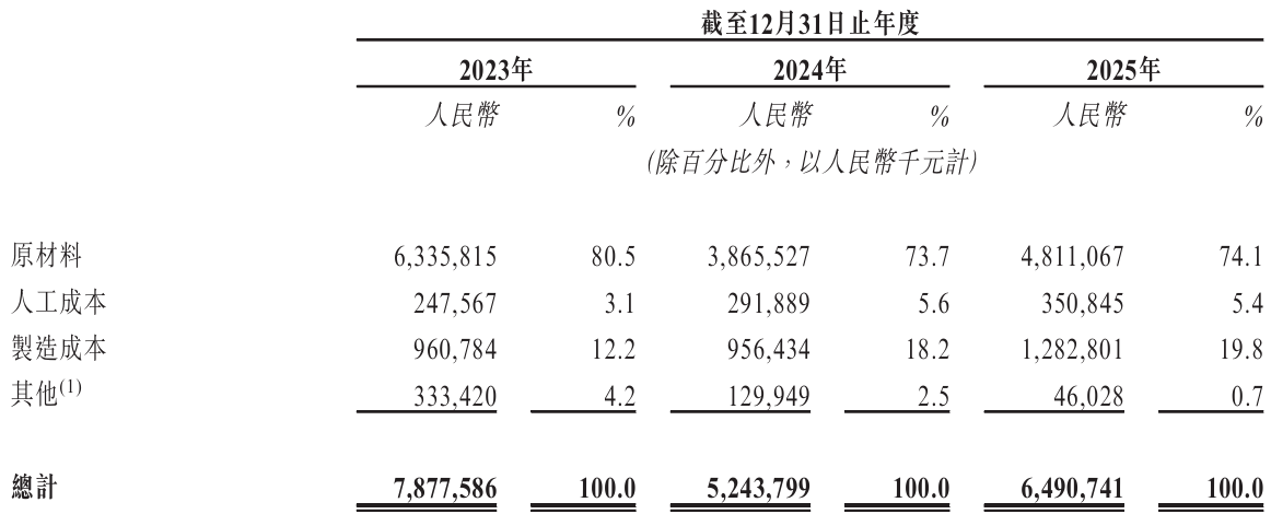 招股书显示,2025年公司原材料成本占比高达74.1%。由于目前自供锂精矿比例仅约为15.5%,这种低自给率导致其毛利率持续低于行业平均,较龙头企业低出8.5-10.5个百分点。