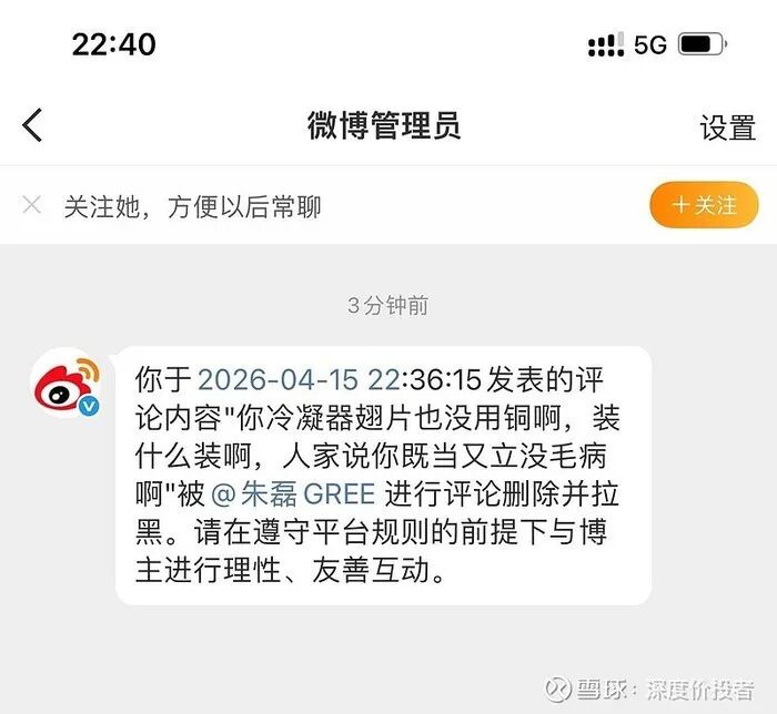 4月15日晚,在朱磊相关微博评论区,有用户指出“冷凝器翅片并非铜材,相关‘全铜’表述存在解释空间”。据社交平台显示,该评论随后被删除。从这一细节来看,围绕“全铜”定义的争议,已从企业之间延伸至消费者层面的直接质疑。