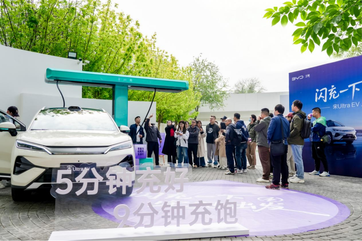 宋Ultra EV 搭载第二代刀片电池、闪充技术及激光雷达三大行业颠覆性技术。新车搭载的闪充技术带来出行新体验。常温下,5分钟电量告急秒“回血”,喝杯咖啡、刷会视频就能继续出发;9分钟从10%充到97%,节假日出行无需久留服务区。零下30℃也仅多3分钟。充电如加油,告别久等焦虑与规划,畅享纯电出行松弛感。现场特设一首歌的时间闪充体验区,嘉宾可现场直观感受,一曲唱罢,电量高效补能,闪充实力一目了然。