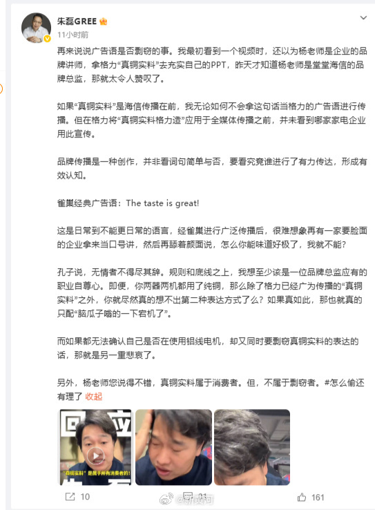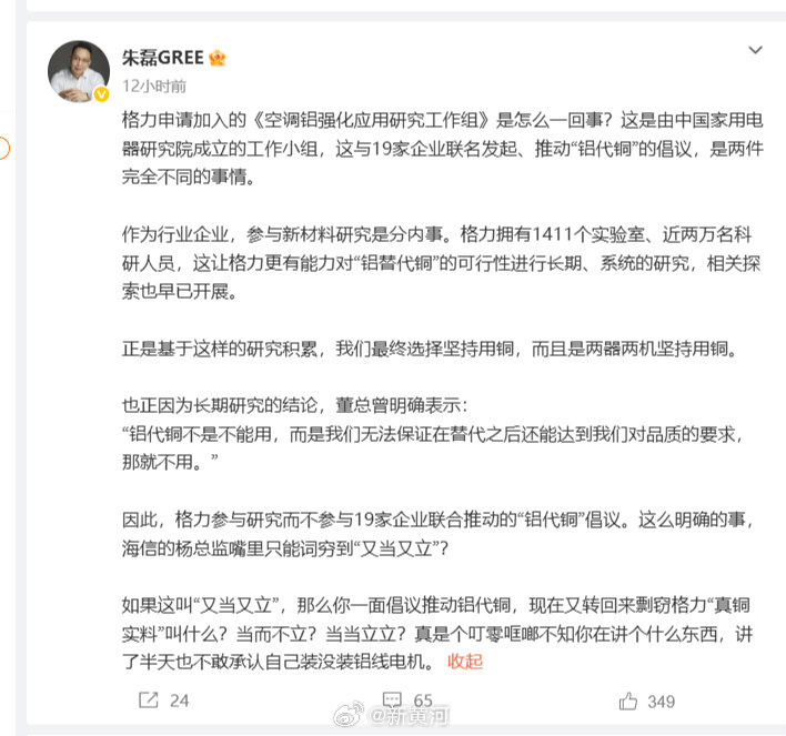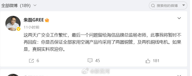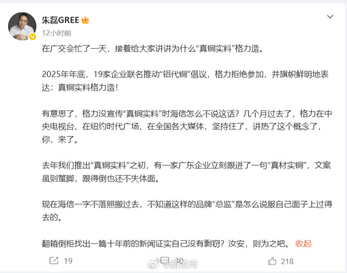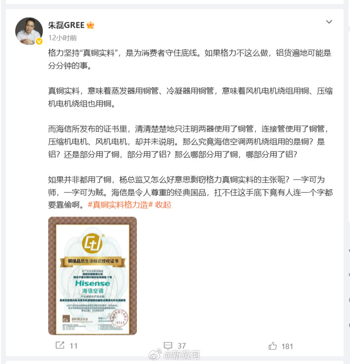 格力电器高管深夜连发五文,回应与海信的“真铜实料”争议