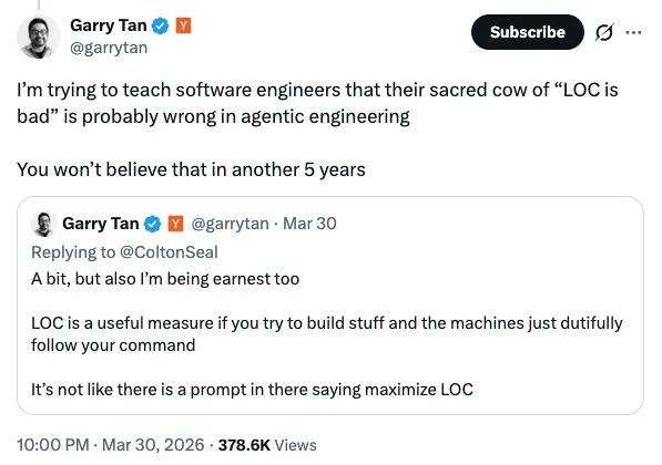 “同时推进 5 个项目,现在平均一天能产出 3.7 万行代码......我最近一直在试着让软件工程师接受一件事:你们一直奉为圭臬的那句‘代码行数没意义’,到了 agentic engineering 时代,可能没那么对了。再过 5 年,你们大概不会相信自己当年真这么想过。”