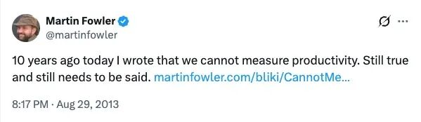 几十年来,怎么衡量开发者的生产力,在软件行业里争议不断。十年前,Martin Fowler 甚至认为,开发者的生产力是无法真正被衡量的。