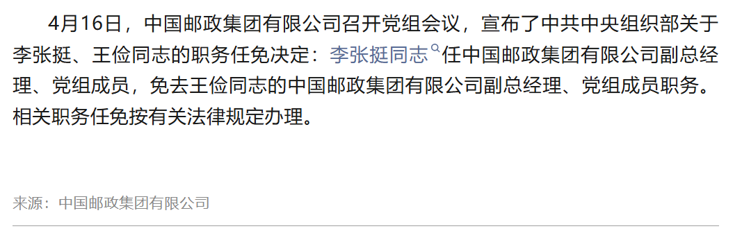 4月16日,中国邮政集团有限公司召开党组会议,宣布了中共中央组织部关于李张挺、王俭同志的职务任免决定:李张挺同志任中国邮政集团有限公司副总经理、党组成员,免去王俭同志的中国邮政集团有限公司副总经理、党组成员职务。相关职务任免按有关法律规定办理。