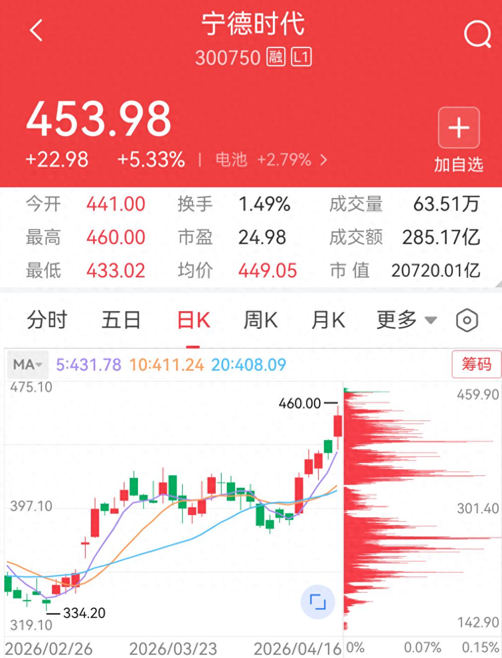 4月16日,宁德时代A股股价再创2018年上市以来新高。盘中,股价触及460元/股,全天收于453.98元/股,所对应的最新市值为20720.01亿元。