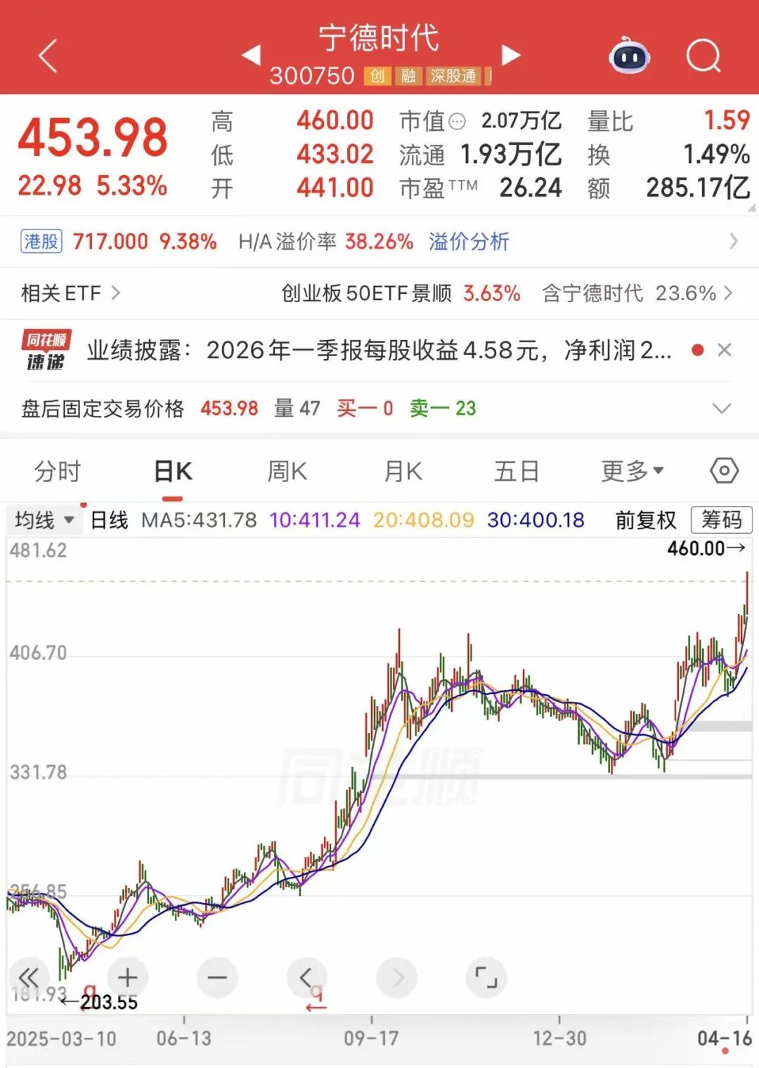 今天,宁德时代气势如虹,受一季报优秀业绩刺激,A股盘中最大涨幅超过6%,收盘涨幅定格在5.33%,报收于453.98元,市值突破两万亿。