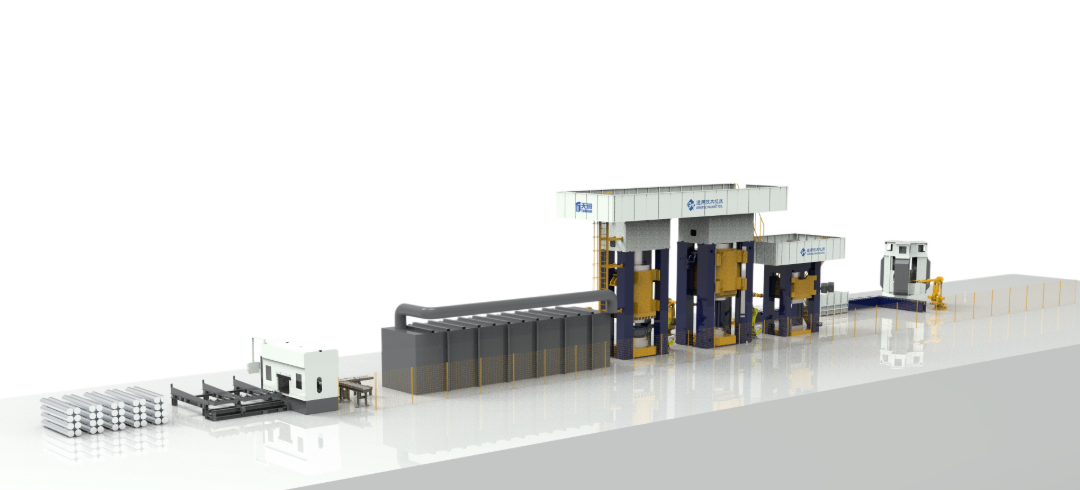 该产线专为高品质铝合金轮毂高效智能制造设计。产线集成加热炉、预锻压机、终锻压机、扩孔锻压机、旋压机、转运机器人及喷墨机器人等关键装备,实现轮毂从坯料加热、预锻、终锻、扩孔到旋压成型的全流程自动化生产。产线压制重复定位精度≤0.1mm,力有保证轮毂尺寸一致性与稳定性;压力与运行速度可灵活设定调节,适配多规格、多工艺轮毂柔性化生产需求。同时采用电液比例柔性泄压技术,能抑制设备冲击、降低运行振动,显著优化生产作业环境,提升设备运行稳定性与使用寿命,为汽车轻量化轮毂制造提供智能、高效、稳定的成套解决方案。