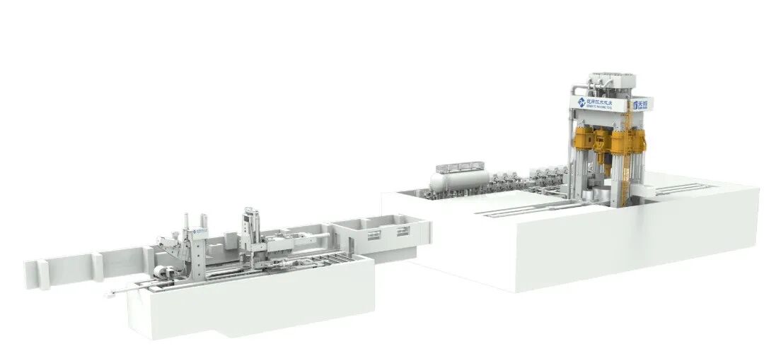 该产线是通用技术集团自主研发的自由锻碾环机产线,广泛应用于风电等关键领域大型锻件制造。产线集成拔长、镦粗、冲(扩)孔、芯棒扭转、弯曲、错移剁切等全工序工艺,可一站式完成自由锻、环锻及轧环加工,保障典型环/筒形件圆度精度小于外径的2‰。产线配置覆盖全面,锻造压机公称力规格涵盖800T至13500T,辗环机可加工轧环外径范围覆盖16m至2000mm,满足超大规格锻件制造需求。产线采用多工位精密自由锻制坯冲孔工艺,实现墩粗、预冲孔、终冲孔及马架扩孔等工序的连续高效作业;同时搭载轻质回转体构件的精密挤压控制、等温锻速度控制、工艺数据采集及自学习式故障运维系统,保障产线长期高效、稳定、可靠运行,为重大装备核心锻件国产化提供坚实装备支撑。