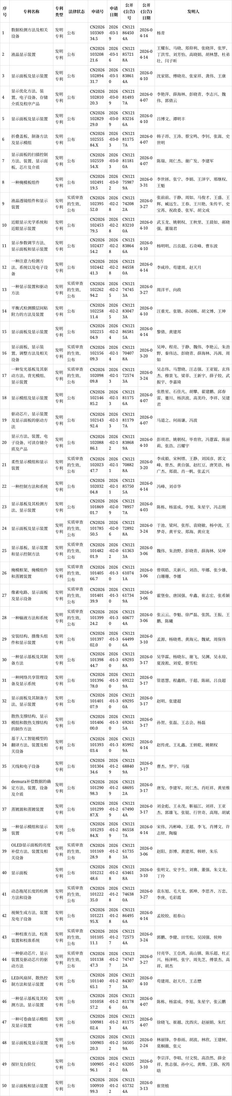京东方科技集团股份有限公司近期专利情况如下: