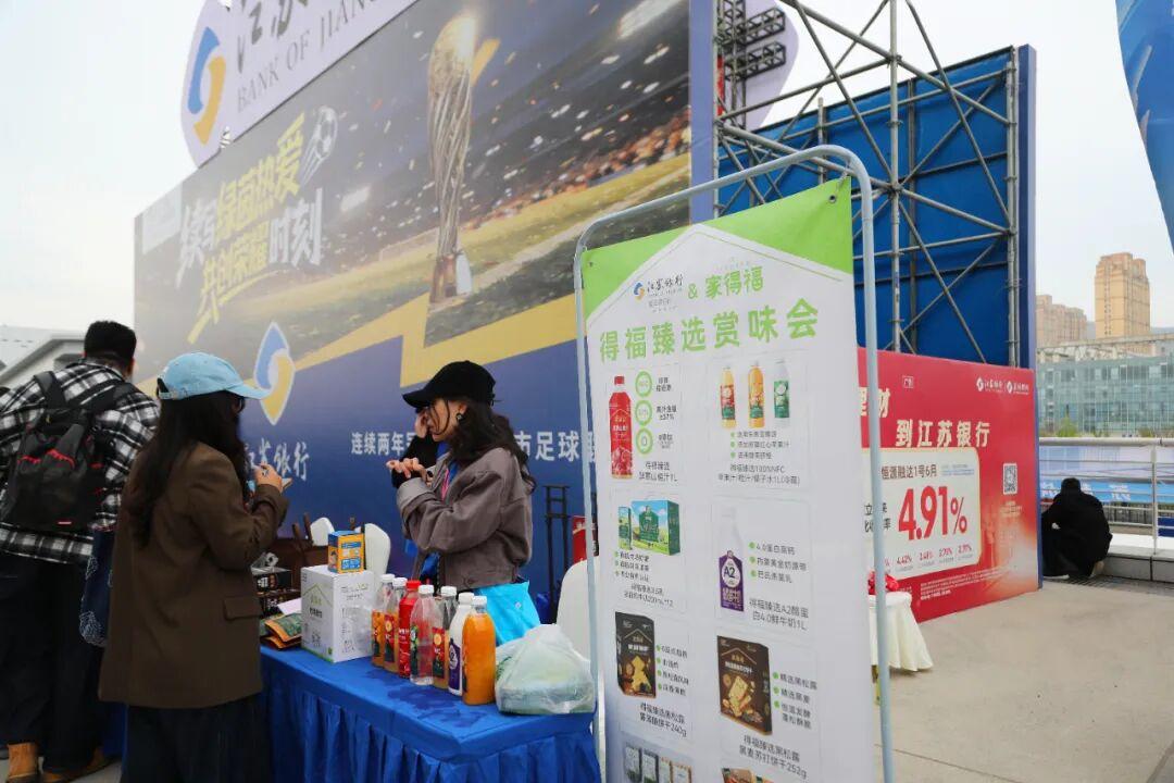 在山海之城连云港赛场,江苏银行连云港分行提前部署、精心策划,在作为主场场地的体育馆中心主入口内场中心位置搭建了8个特色金融服务专区,并联合多家政企单位,推出一系列贴近球迷、服务赛事的金融便民举措。例如,该分行携手连云港本土最大、最具影响力的民营零售连锁集团家得福,创新推出"金融+消费"特色体验,在专区内开展得福臻选商品免费品鉴赏味活动,让球迷在观赛之余免费品尝地道港城美味,既带动本土品牌消费,又拉近了与市民的情感距离。