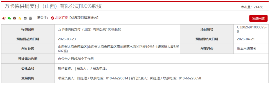近期,北京产权交易所披露万卡德供销支付(山西)有限公司(以下简称“万卡德山西”)100%股权转让信息,转让人为中国供销电子商务有限公司(以下简称“中国供销电子”),但转让底价尚未公布。