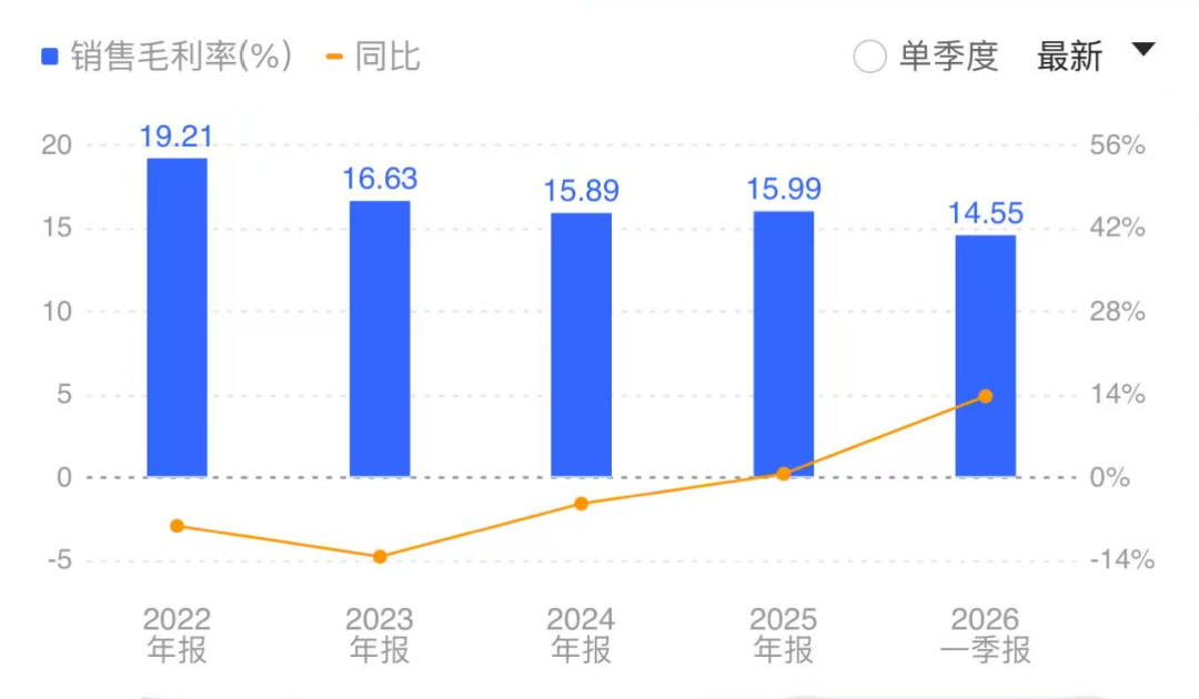 看,蓝思科技的毛利率,2022年的时候还有19.21%,眼下连15%都保不住了;