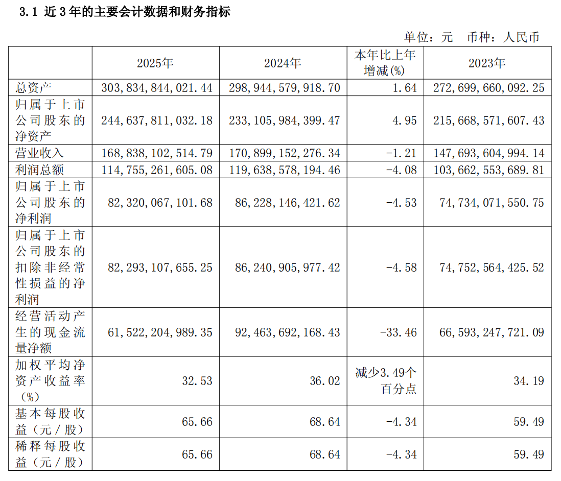 2025年,贵州茅台营收1688.38亿元,同比下降1.21%;利润总额为1147.55亿元,同比下降4.08%;归母净利润823.20亿元,同比降幅4.53%。