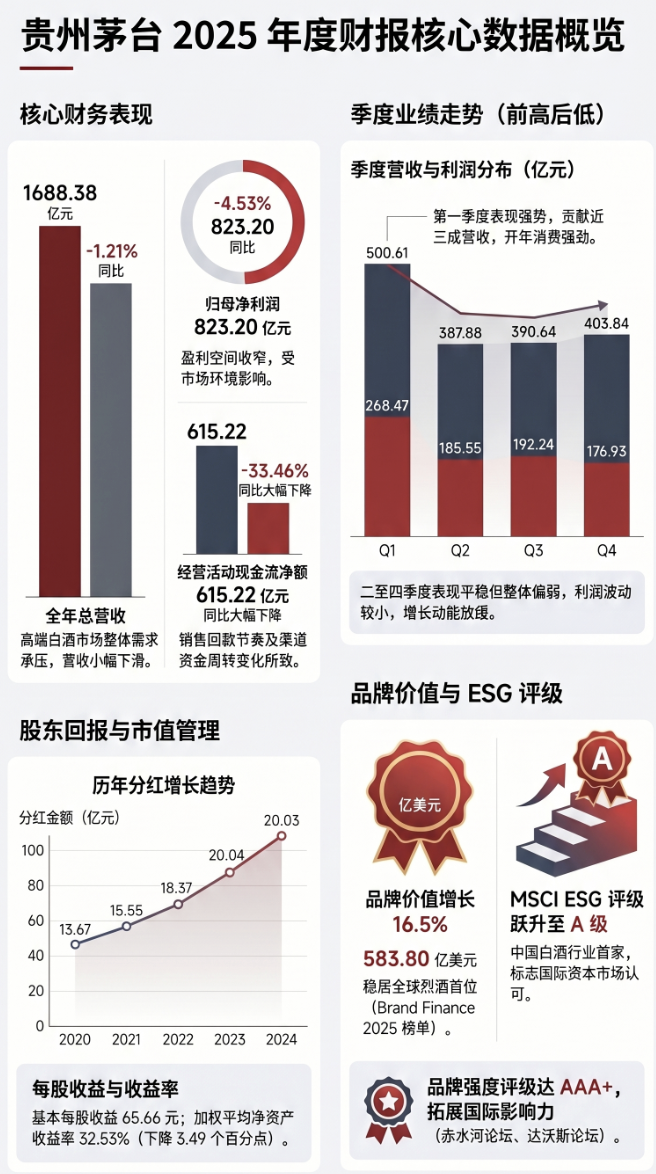 贵州茅台2025年实现营收1688.38亿元,同比下降1.21%;归母净利润823.20亿元,同比下降4.53%。折射出高端白酒市场需求承压的整体格局。