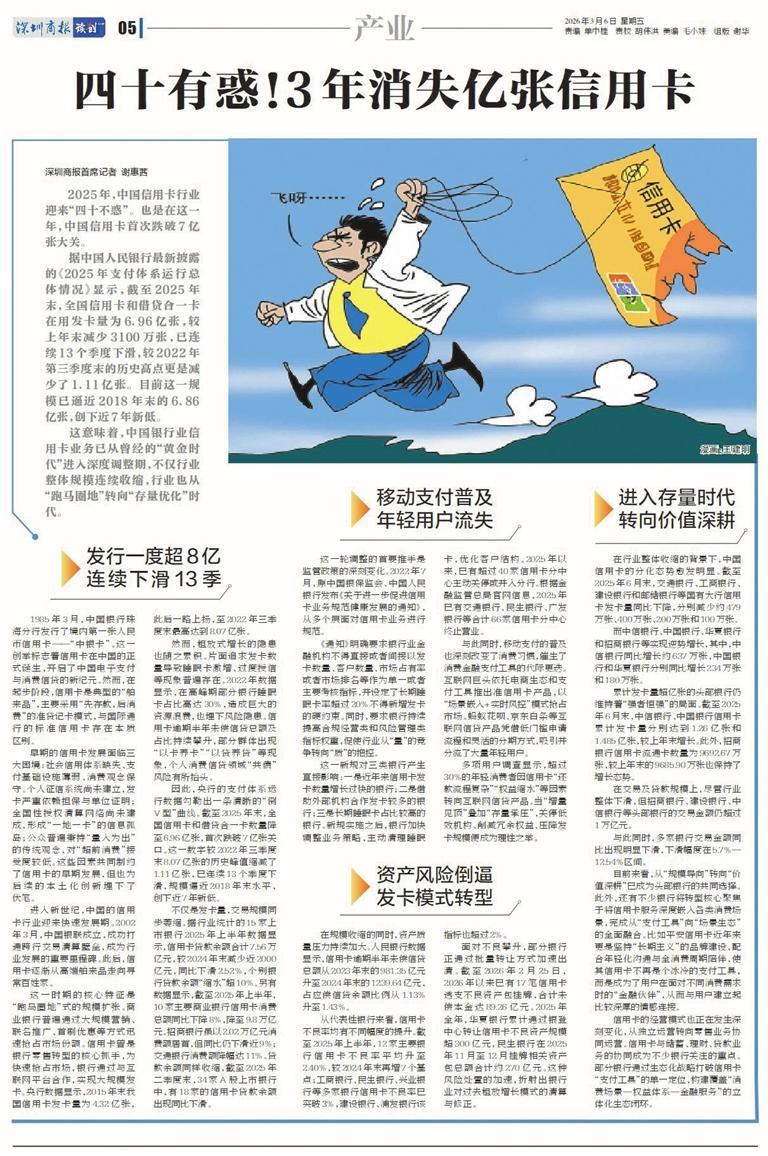 据中国人民银行前不久披露的《2025年支付体系运行总体情况》显示,截至2025年末,全国信用卡和借贷合一卡在用发卡量为6.96亿张,较2024年末减少3100万张;较历史高点减少1.11亿张,多家国有大行选择主动收缩。(见本报报道《四十有惑!3年消失亿张信用卡》)
