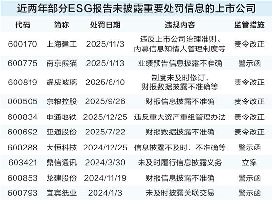 例如2025年1月南京熊猫因业绩预告与实际业绩差异较大、净利润盈亏性质发生变化的信息披露不准确事项被出具警示函;2025年9月京粮控股因子公司开展的贸易无商业实质或收入确认不符合会计准则规定被责令改正,相关信息均未在ESG报告中体现。