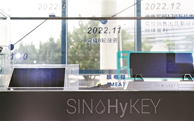 在该公司展厅,一张仅几十微米厚的黑色薄板吸引了记者的注意。原来,它就是被喻为氢燃料电池系统核心“芯片”的膜电极。电堆内,在数百张膜电极和双极板的“协作”下,氢能才能迅速、高效转化为电能。
