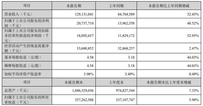 4月15日晚,宁德时代披露2026年一季度财报。公司单季营收达1291.31亿元,同比增长52.45%;归母净利润达207.38亿元,同比增长48.52%。经计算,该季度宁德时代平均每天净赚约2.3亿元。