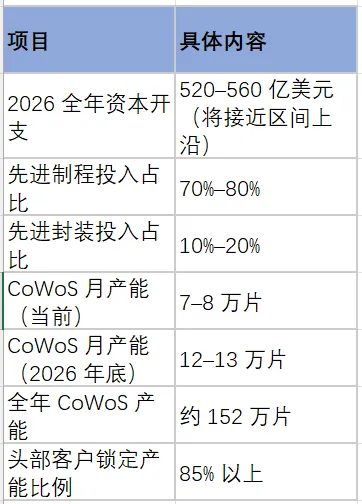 资本开支瞄准区间上沿。全年资本支出520-560亿美元,明确将接近高标,70%-80%投入先进制程,10%-20%投入先进封装。