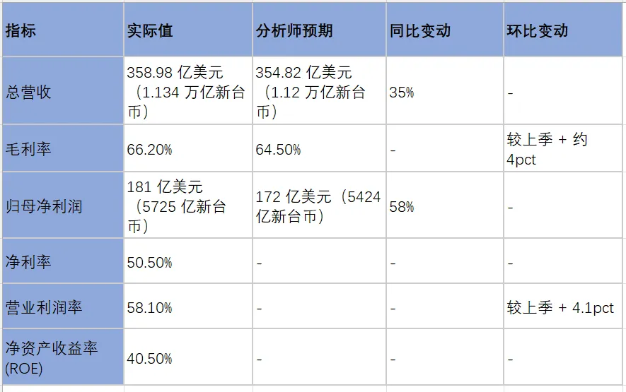 美东时间4月16日,台积电公布了2026年第一季度的财务报告,录得总营收358.98亿美元(1.134万亿新台币),高于分析师预期的354.82亿美元(1.12万亿新台币),毛利率达到了66.2%,大幅高于预估的64.5%,归母净利润录得181亿美元(5,725亿新台币),同样明显高于分析师预测的172亿美元(5,424亿新台币)。