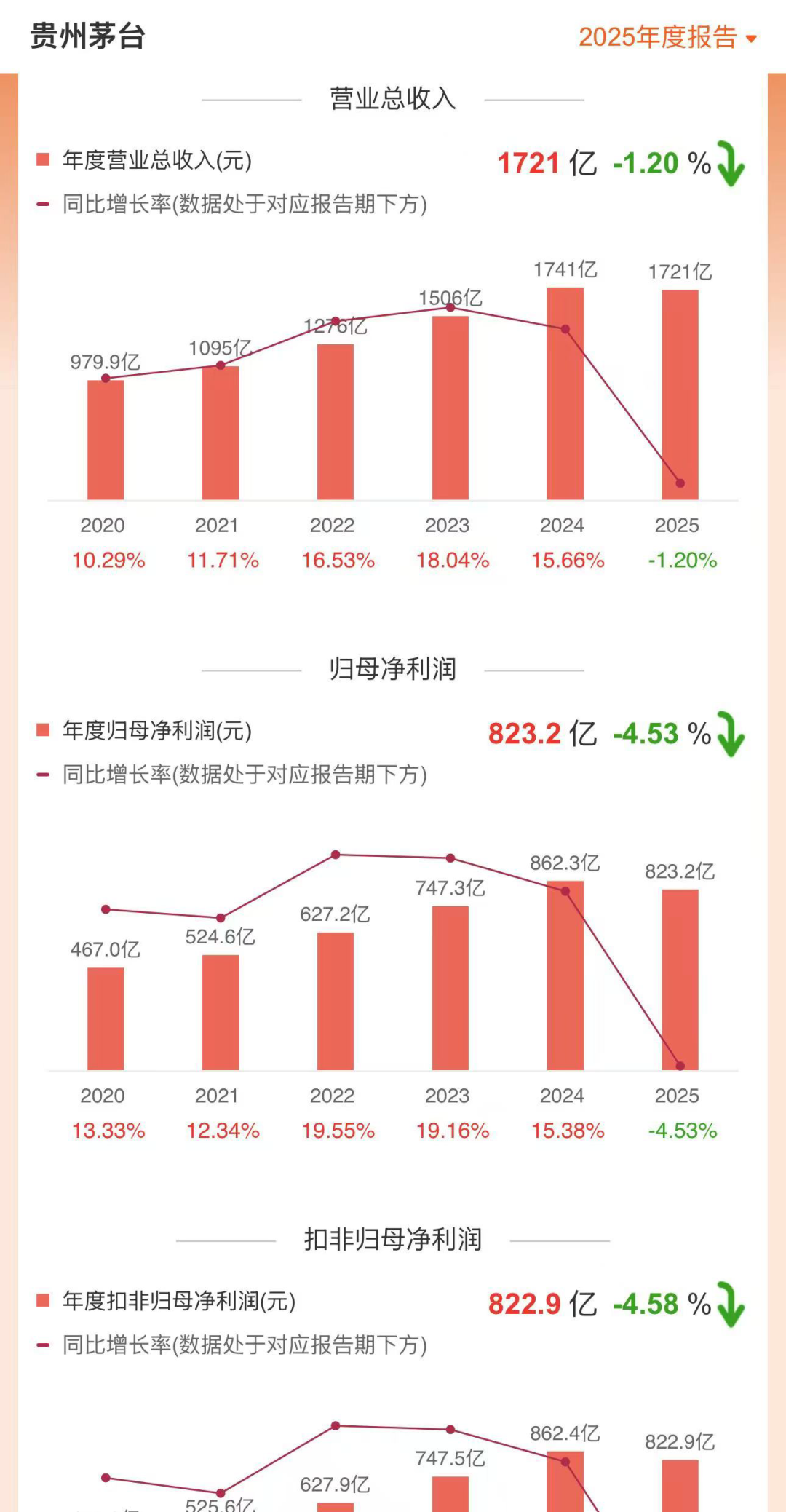 6.张德芹(2024-2025):作为茅台新掌舵人,其任职期间(2024年4月至2025年)遭遇贵州茅台2001年上市以来首次营收、净利双负增长(2025年营收同比-1.21%、归母净利润同比-4.53%),压力巨大。值得注意的是,2025年10月25日,茅台集团宣布人事调整,张德芹不再担任茅台集团董事长职务,另作他任,由贵州省能源局局长陈华接任,其任职未满两年便卸任,与此次茅台25年来首次下跌的经营压力存在直接关联。作为从茅台车间走出的“老茅台”,张德芹此番卸任颇受外界意外,其后续任职安排暂未进一步公开。