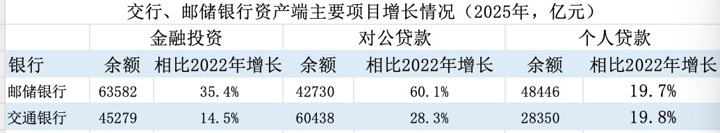 分析来看,主要因为邮储银行对公贷款、金融投资增长较快。2025年末邮储银行对公贷款余额4.3万亿元,相比2022年末增长了60%,这一增速是交通银行同期增速的两倍。