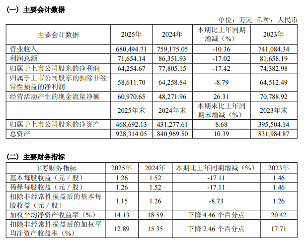 摘要2025年年度营业收入68.05亿元,同比下降10.36%;归属于上市公司股东的净利润为6.43亿元,同比下降17.42%;基本每股收益为1.26元/股,同比下降17.11%。