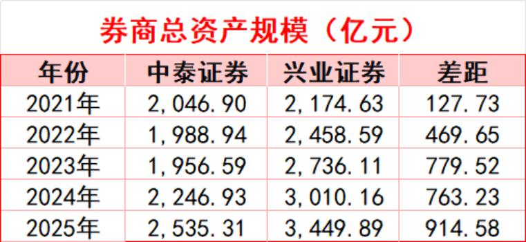 从表格直观看出,2021年,中泰证券与兴业证券总资产差距127.73亿元,到了2025年,两者差距拉大至914.58亿元,逼近千亿了。
