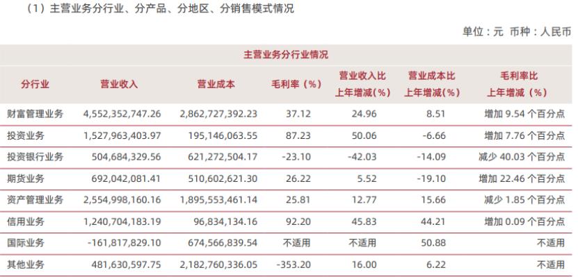 期内,中泰证券投资银行业务实现营业收入5.05亿元,同比下降42.03%,毛利率为-23.1%,主要系公司股权和债券承销规模下降导致证券承销业务收入同比减少。